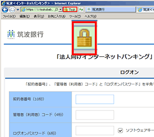 筑波銀行のインターネットバンキングは常にSSLで暗号化された通信を行い、ブラウザ画面に「鍵マーク」が表示されます。この鍵マークをダブルクリックすると、発行先の証明書の画面が表示されますので、発行先を確認してください。