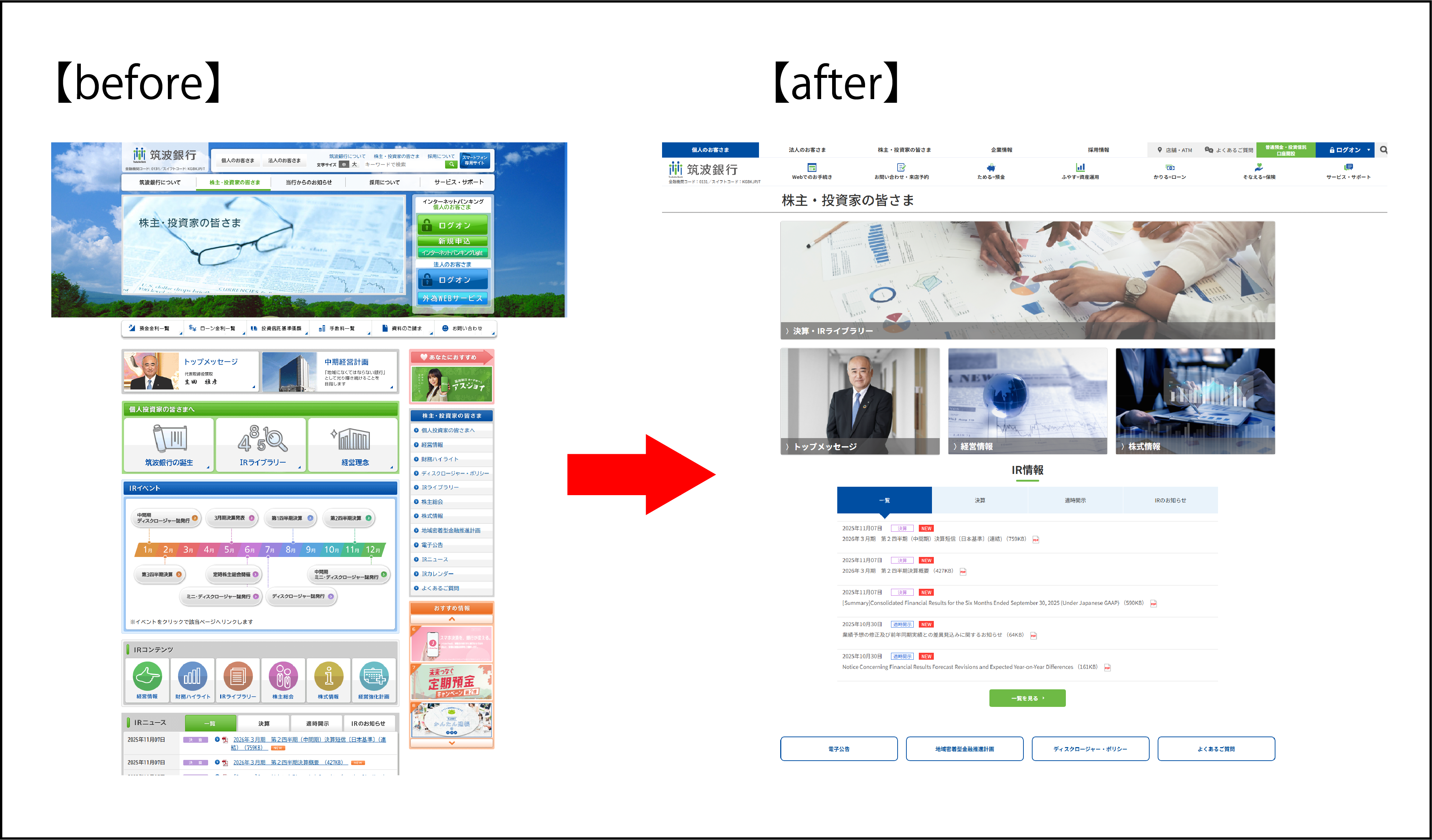 n ユーザーが直感的に必要な情報にアクセスできるようにシンプルで迷わない画面構成に変更し、ユーザー利便性を向上しました。 n 「個人のお客さまページ」、「法人のお客さまページ」と統一したデザインに変更しました。 n スマートフォンでの閲覧に配慮し、見やすいように調整しました。 |