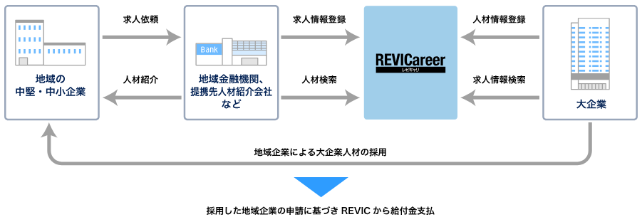 地域の中堅・中小企業による人材の確保を進めるため、REVIC が運営する情報システム「REVICareer レビキャリ」を活用して大企業人材に新たな就業の機会を創出した地域の中堅・中小企業に対して、地域企業経営人材確保支援事業給付金を給付いたします。 本事業は、REVICが実施・運営する金融庁・経済産業省の連携による補助事業です。 |